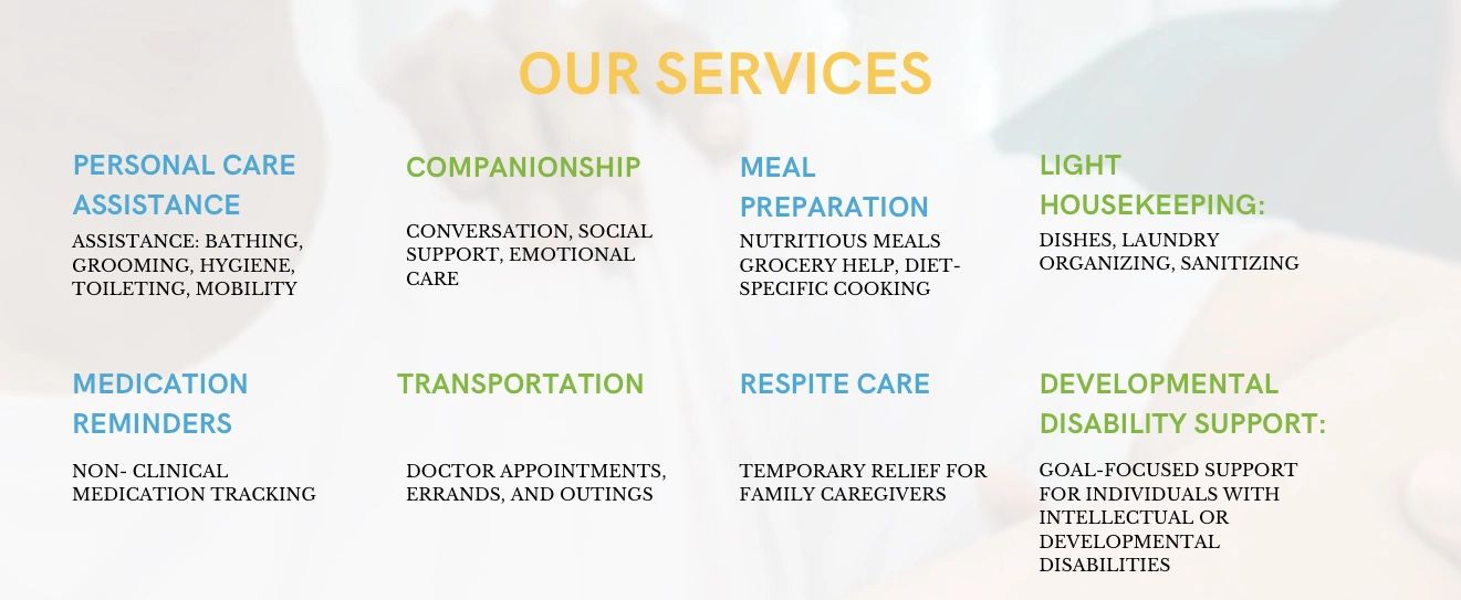 A: We offer non-medical in-home care including personal care, companionship, meal prep, light housekeeping, transportation, and more.